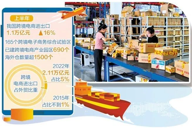 數(shù)據(jù)顯示,2022年,中國跨境電商進出口達2.11萬億元,占外貿(mào)的比重由2015年的不到1%增長至5%。今年上半年,我國跨境電商進出口達1.1萬億元,同比增長16%。165個跨境電商綜試區(qū)已建跨境電商產(chǎn)業(yè)園區(qū)690個,海外倉數(shù)量超1500個。