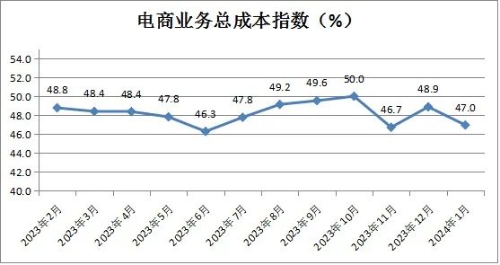 電商業(yè)務(wù)總成本反向指數(shù)為47.0%,較上月小幅下降1.8個百分點(diǎn),表明電商經(jīng)營類企業(yè)電商業(yè)務(wù)總成本有所回升。