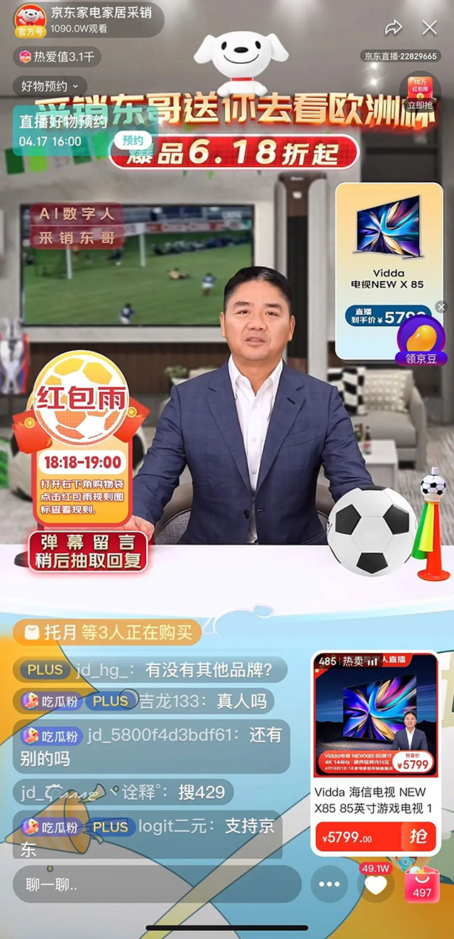 劉強東AI數字人首場直播:不到1小時觀看量超2000萬,整場成交額超5000萬!