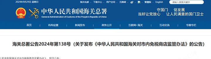 近日,海關(guān)總署公布了《中華人民共和國海關(guān)對市內(nèi)免稅商店監(jiān)管辦法》,自2024年10月1日起施行。