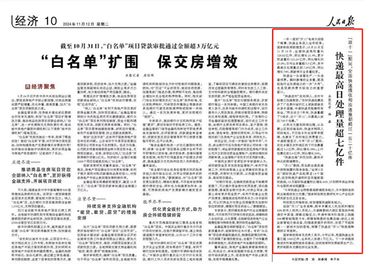 媒體報道人民日報:快遞最高日處理量超七億件