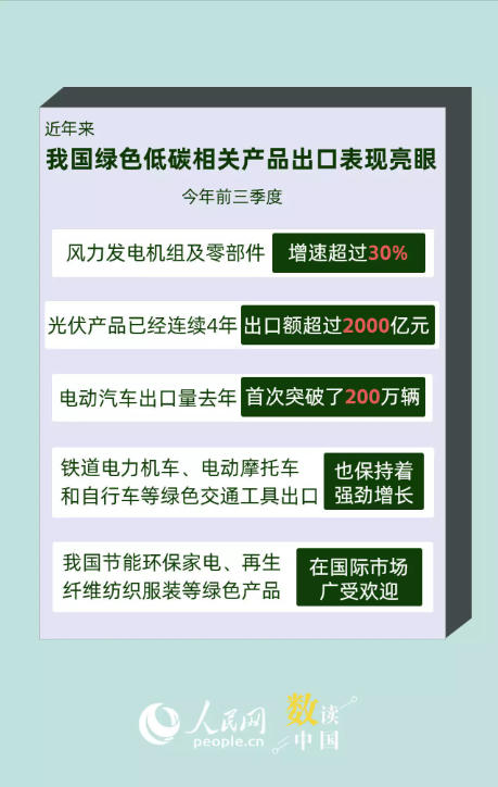 今年前三季度,風力發(fā)電機組及零部件增速超過30%;光伏產(chǎn)品已經(jīng)連續(xù)4年出口額超過2000億元;電動汽車出口量去年首次突破了200萬輛……近年來,中國外貿(mào)企業(yè)積極順應貿(mào)易綠色化趨勢,將綠色低碳理念轉(zhuǎn)化為優(yōu)質(zhì)產(chǎn)品,豐富了全球供給。一組數(shù)據(jù),帶你看中國外貿(mào)“向綠色”發(fā)展步伐加快。